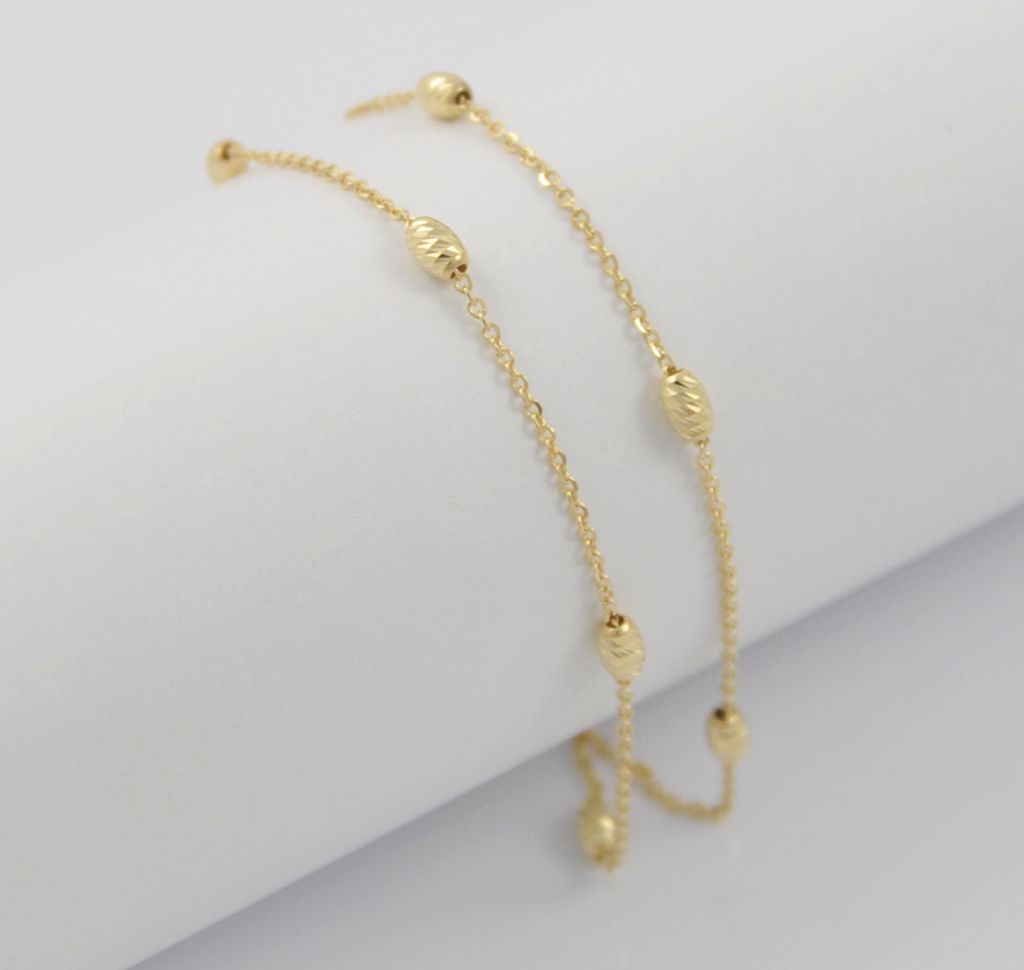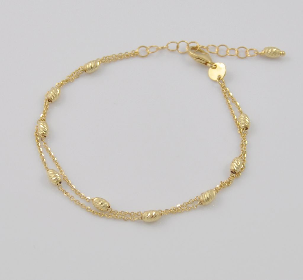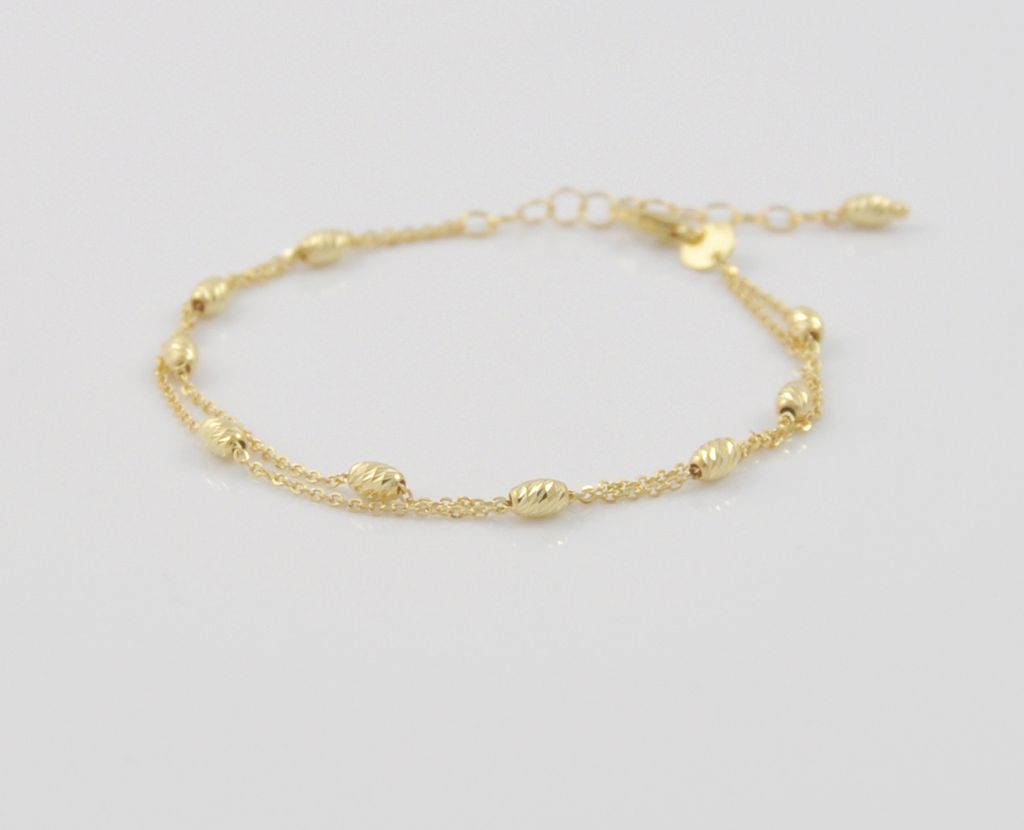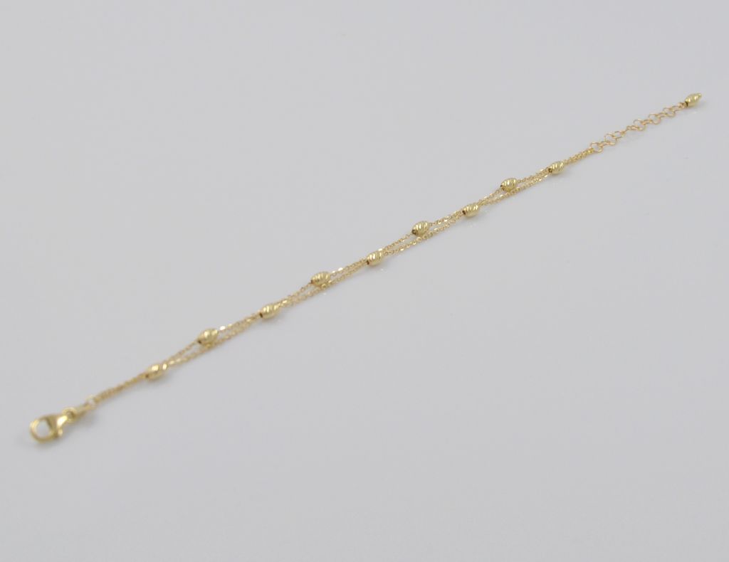 Złota bransoleta wykonana z wysokiej jakości żółtego złota próby 585 (14 karat). Modowa podwójna łańcuszkowa bransoletka ozdobiona diamentowanymi kuleczkami. Długość bransoletki wynosi 19 cm (15,5 cm + 3,5 cm regulacja). Waga bransoletki wynosi 2,32 gr (+/- 0,10 gr).