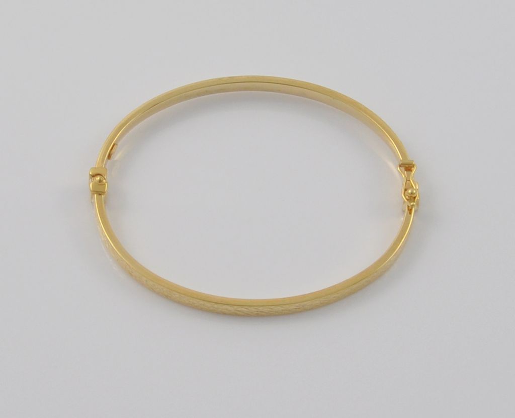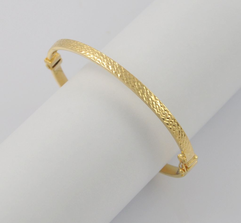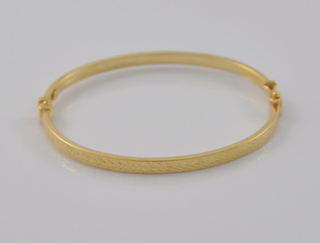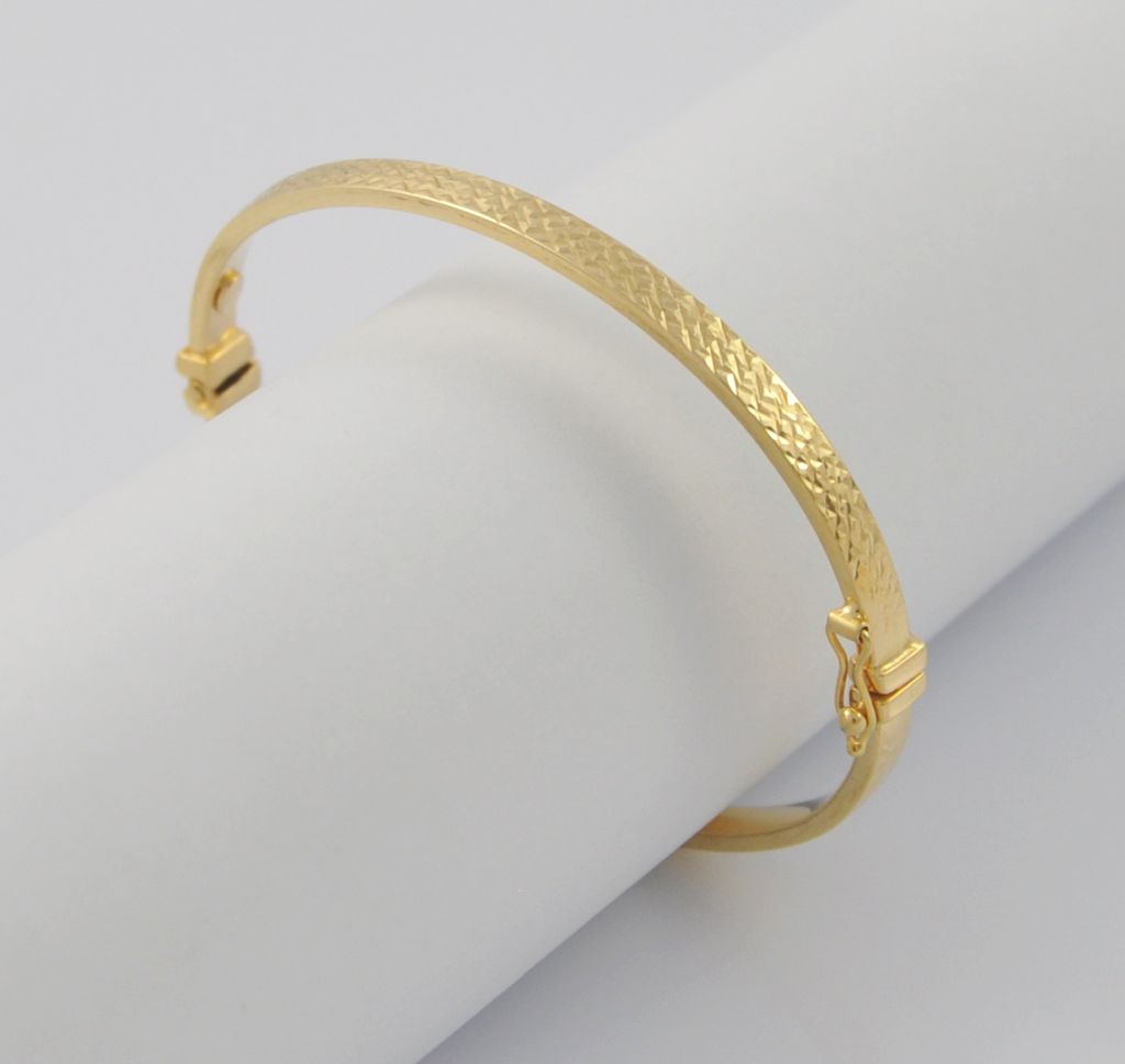 Złota sztywna bransoleta klips wykonana z żółtego złota próby 585 (14 karat). Diamentowana bransoleta o średnicy wzdłuż 60 mm odpowiednia dla ręki o wymiarach 17 cm- 18 cm. Waga bransolety wynosi 5,19 gr (+/- 0,10 gr).