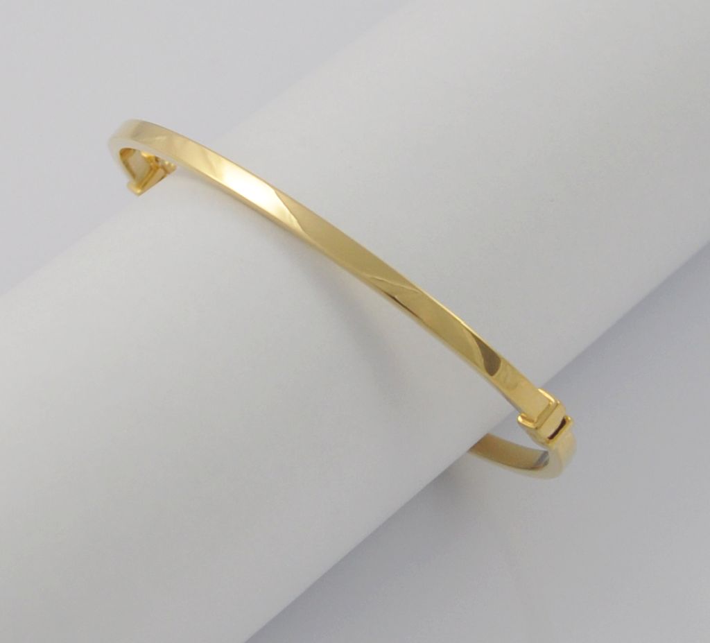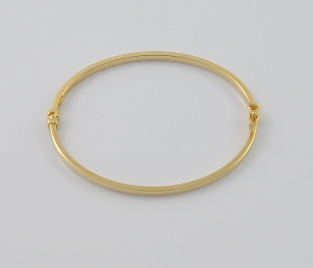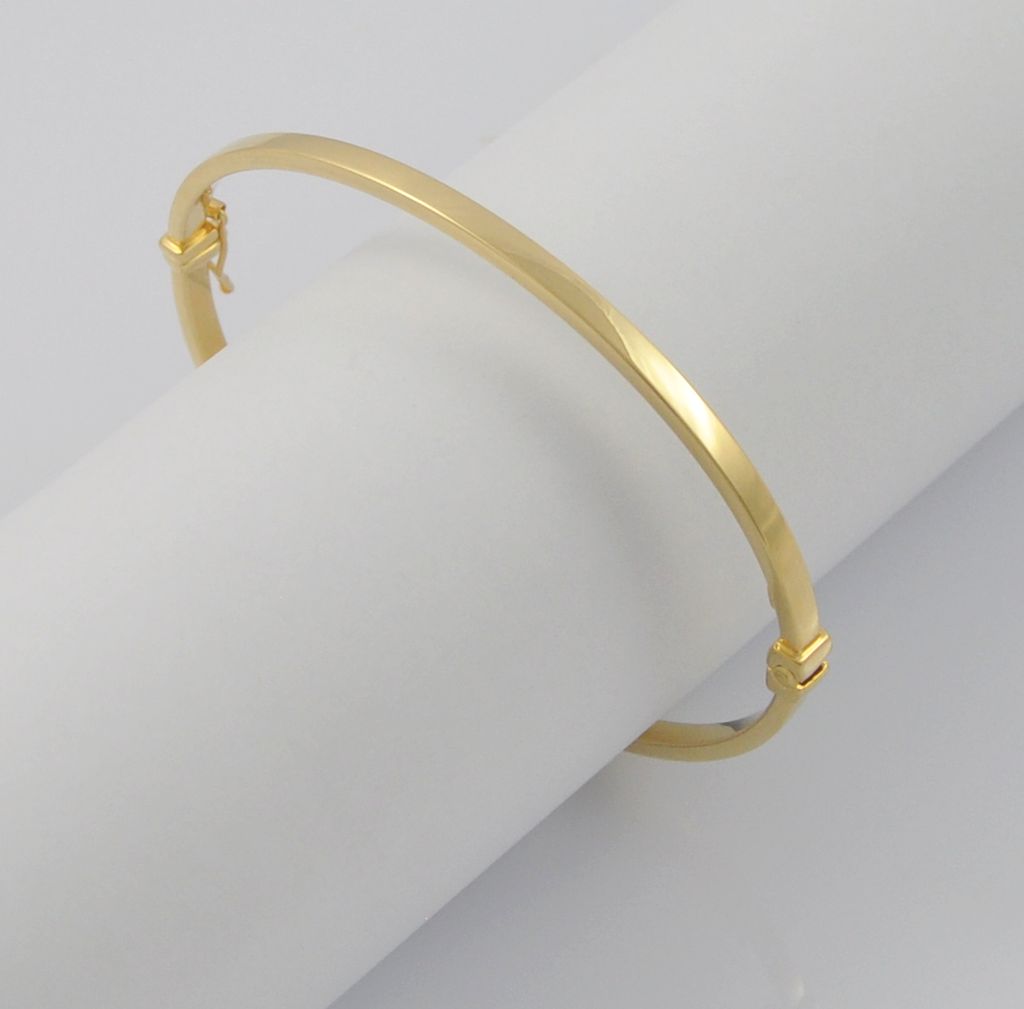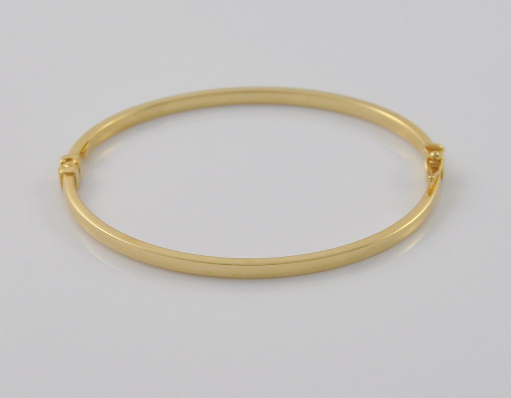 Złota sztywna bransoleta klips wykonana z żółtego złota próby 585 (14 karat). Polerowana bransoleta o średnicy wzdłuż 60 mm odpowiednia dla ręki o wymiarach 17 cm – 18 cm. Waga bransolety wynosi 3,97 gr (+/- 0,10 gr).