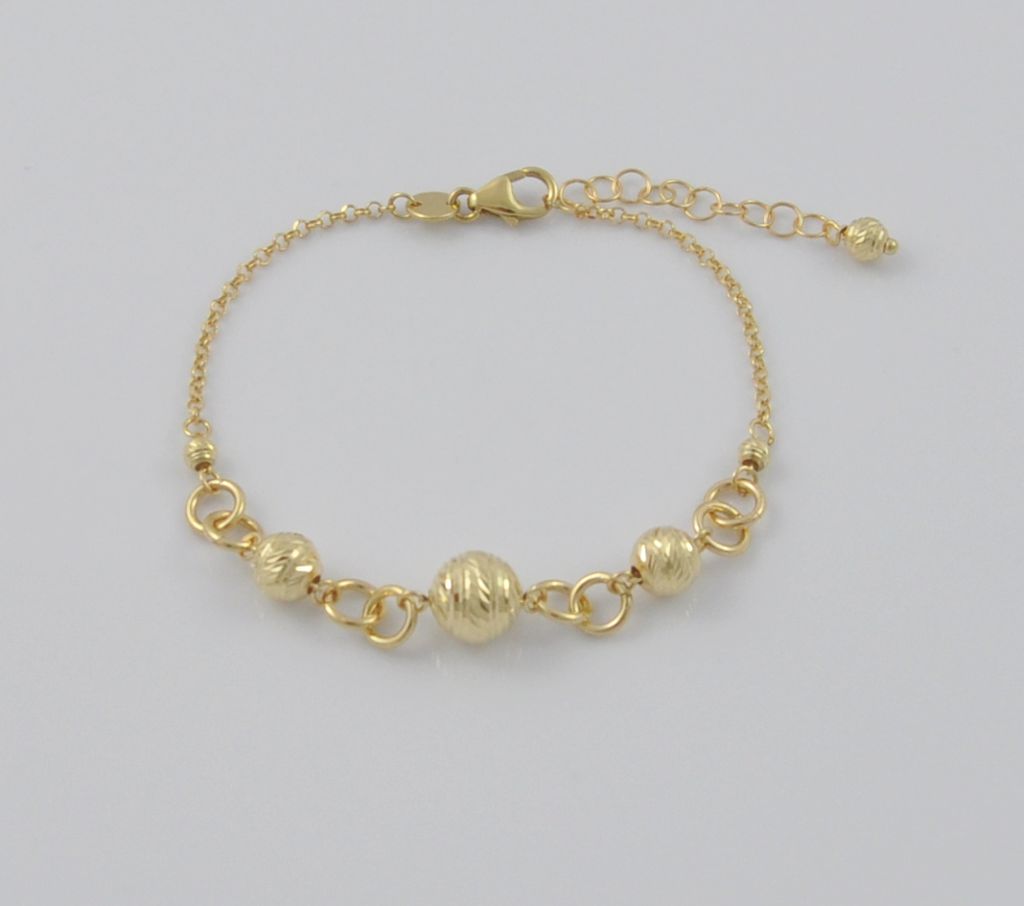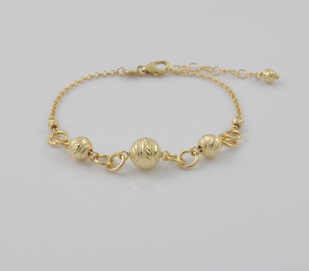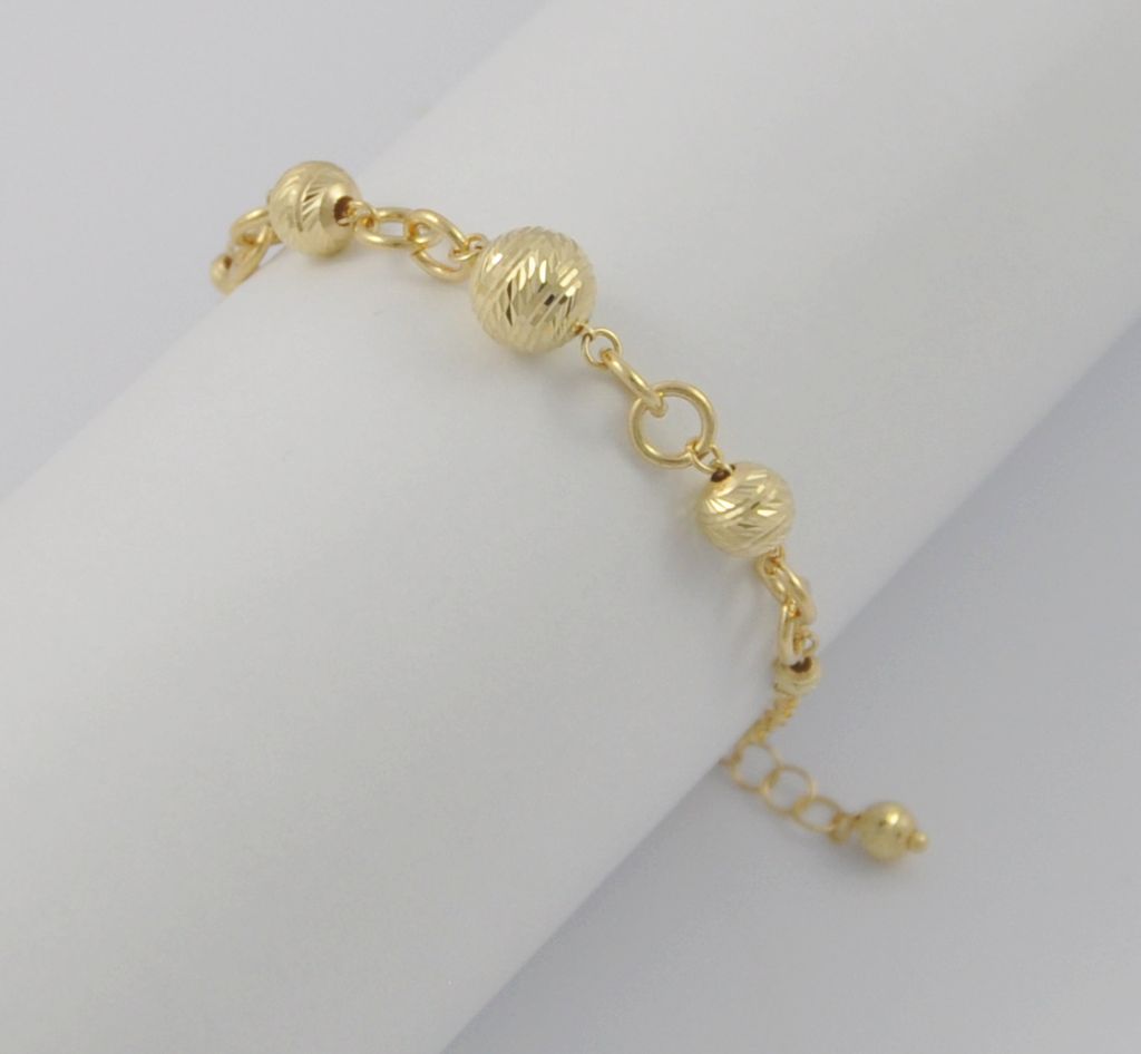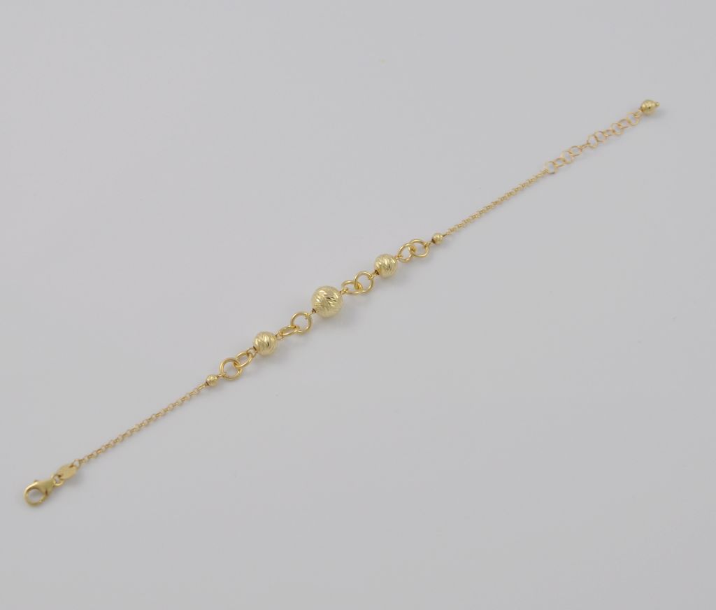 Złota bransoletka wykonana z wysokiej jakości żółtego złota próby 585 (14 karat). Modowa łańcuszkowa bransoletka ozdobiona diamentowanymi kuleczkami. Długość bransoletki wynosi 18,5 cm (15,5 cm + 3 cm regulacja). Waga bransoletki wynosi 3,46 gr (+/- 0,10 gr).