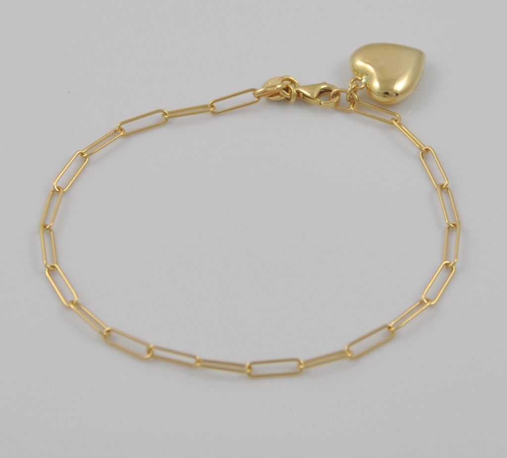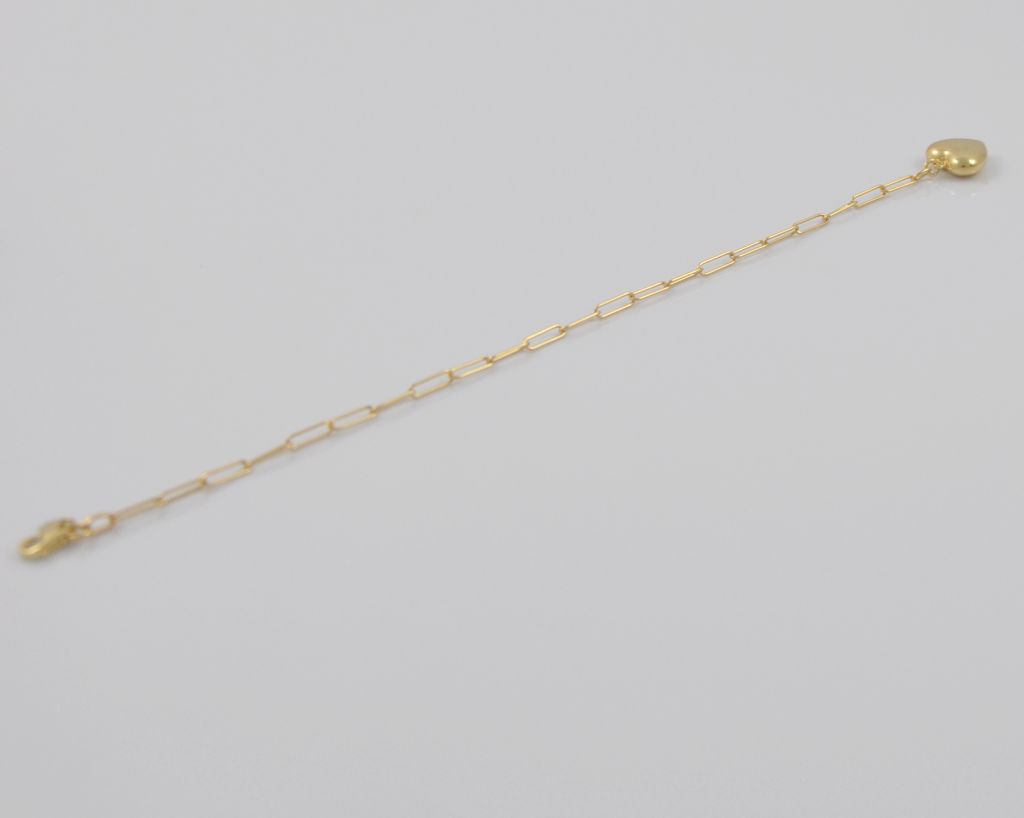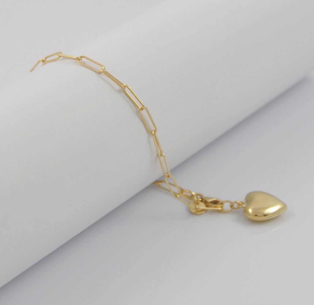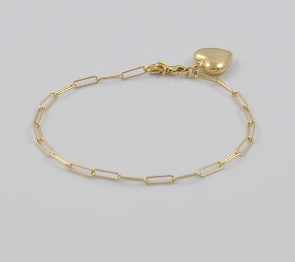 Złota bransoletka wykonana z wysokiej jakości żółtego złota próby 585 (14 karat). Modowa bransoleta długie ogniwa o wymiarach ogniwa 2/8 mm zdobiona złotym polerowanym sercem. Długość bransolety wynosi 18,5 cm. Waga bransolety wynosi 3,37 gr (+/- 0,10 gr).