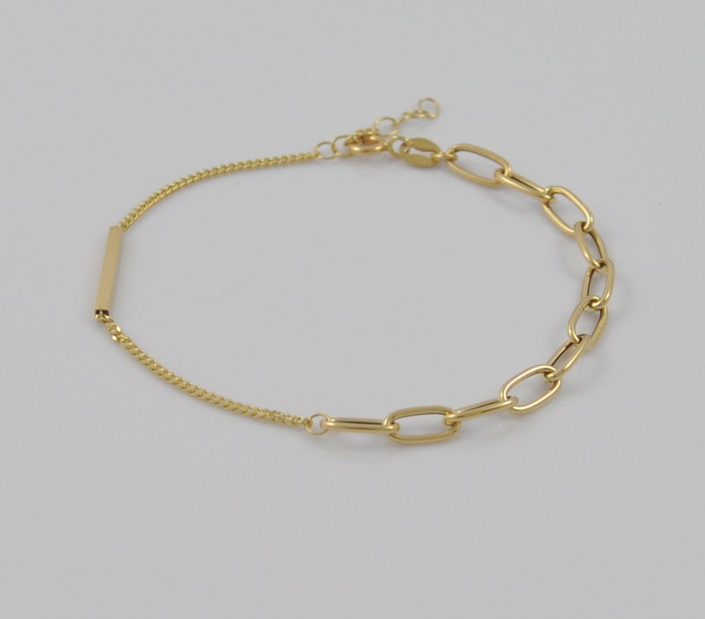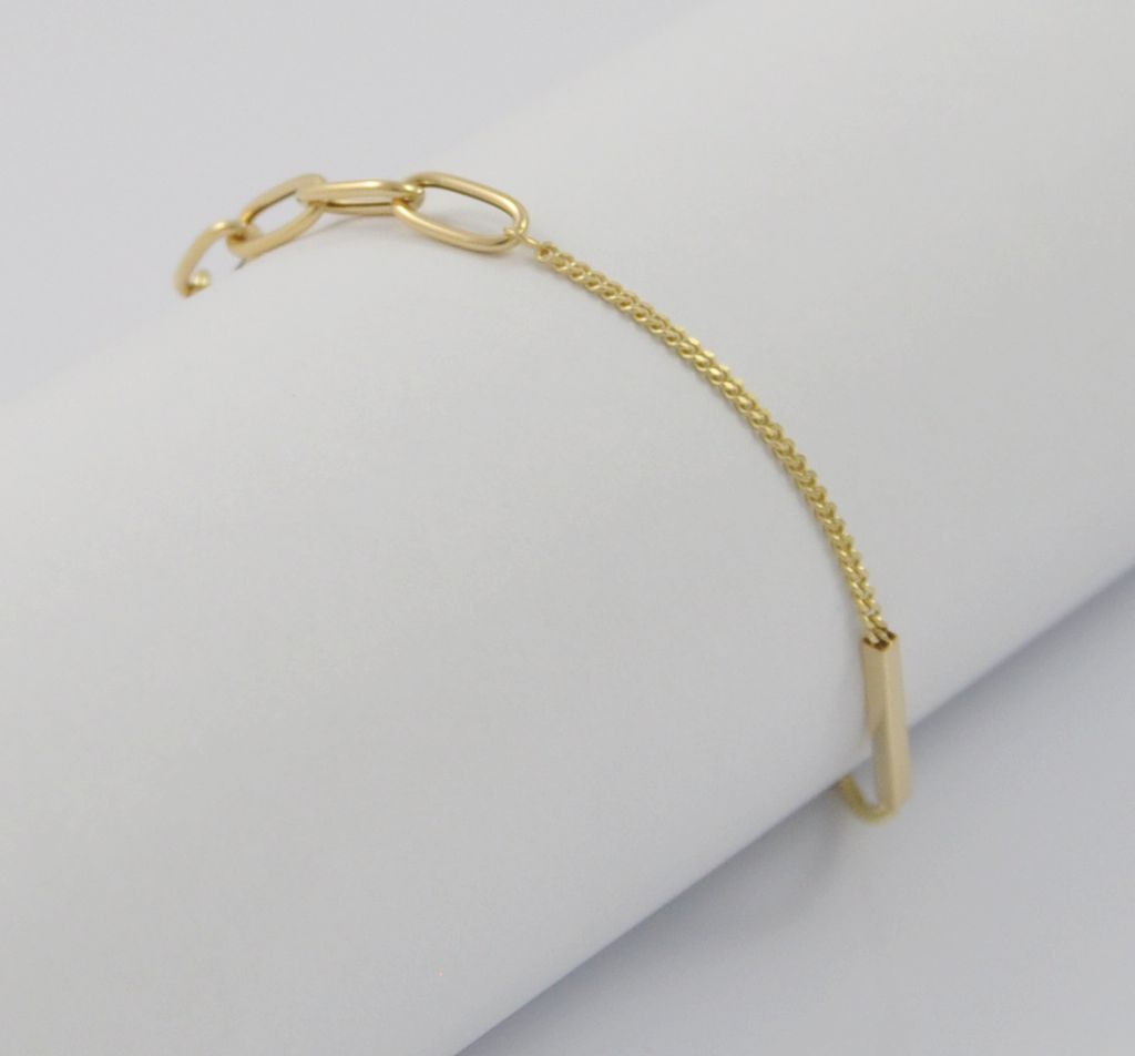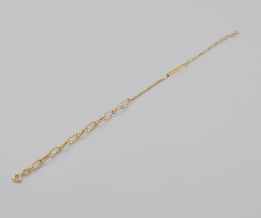 Złota bransoletka wykonana z wysokiej jakości żółtego złota próby 585 (14 karat). Modowa łańcuszkowa bransoletka ozdobiona jedenastoma ogniwami oraz złotą polerowaną kostką. Długość bransoletki wynosi 19 cm (17 cm + 2 cm regulacja). Waga bransoletki wynosi 1,64 gr (+/- 0,10 gr).
