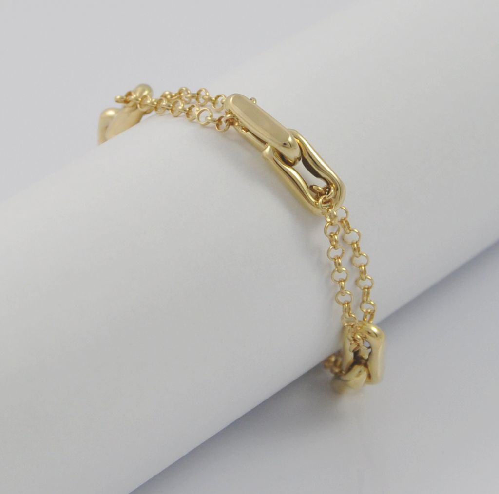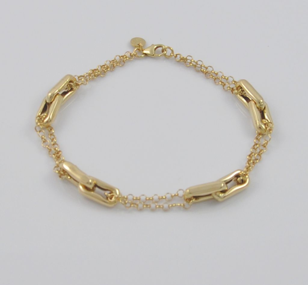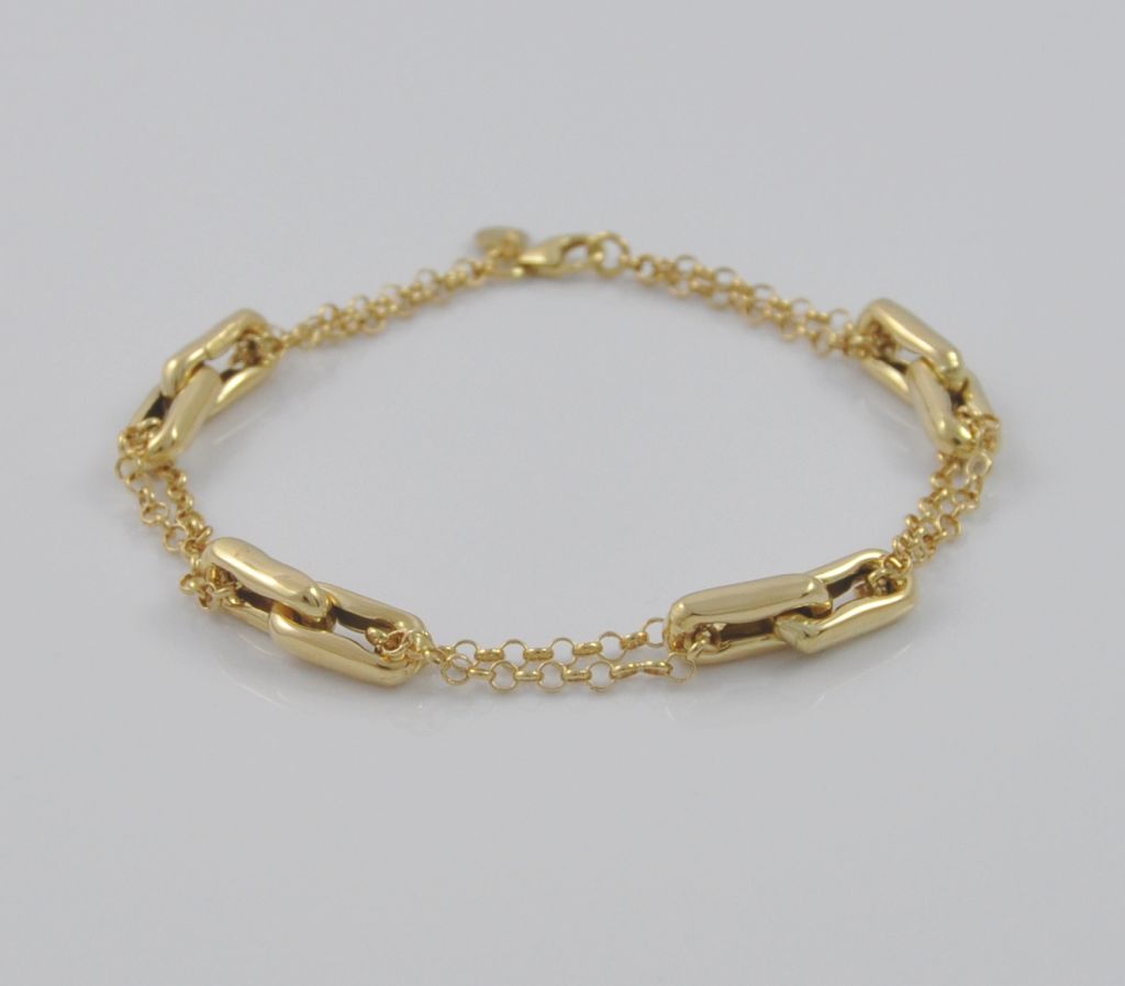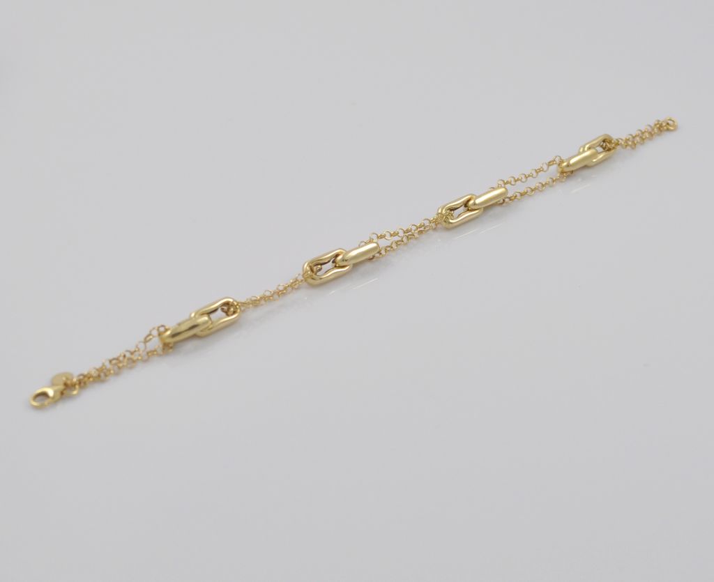 Złota bransoletka wykonana z wysokiej jakości żółtego złota próby 585 (14 karat). Modowa podwójna łańcuszkowa bransoleta ozdobiona czterema podwójnymi ogniwami. Długość bransoletki wynosi 20,5 cm. Waga bransoletki wynosi 5,65 gr (+/- 0,10 gr).