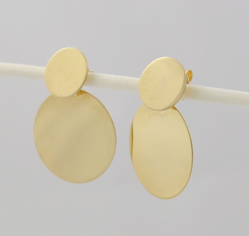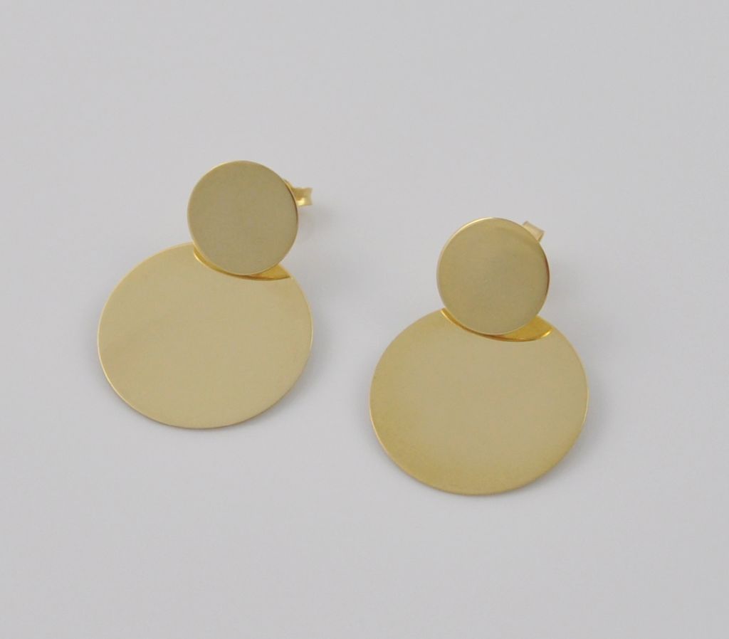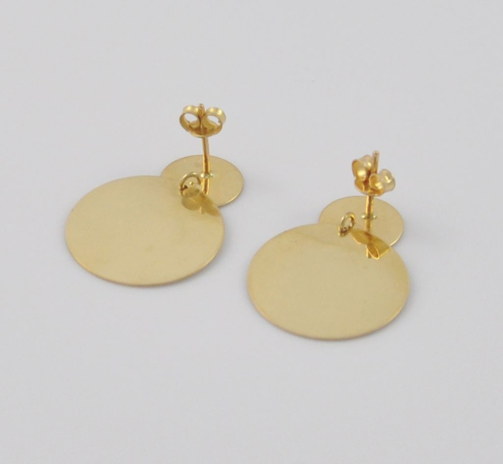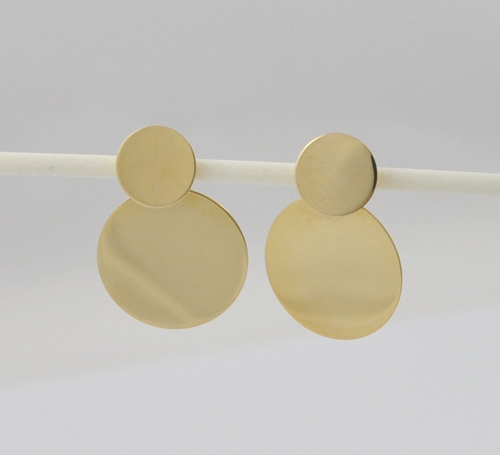 Złote polerowane kolczyki wykonane z wysokiej jakości żółtego złota próby 585 (14 karat). Modowe polerowane blaszki. Średnica małej blaszki 11 mm, średnica dużej blaszki 20 mm. Waga kolczyków wynosi 4,11 gr (+/- 0,10gr).