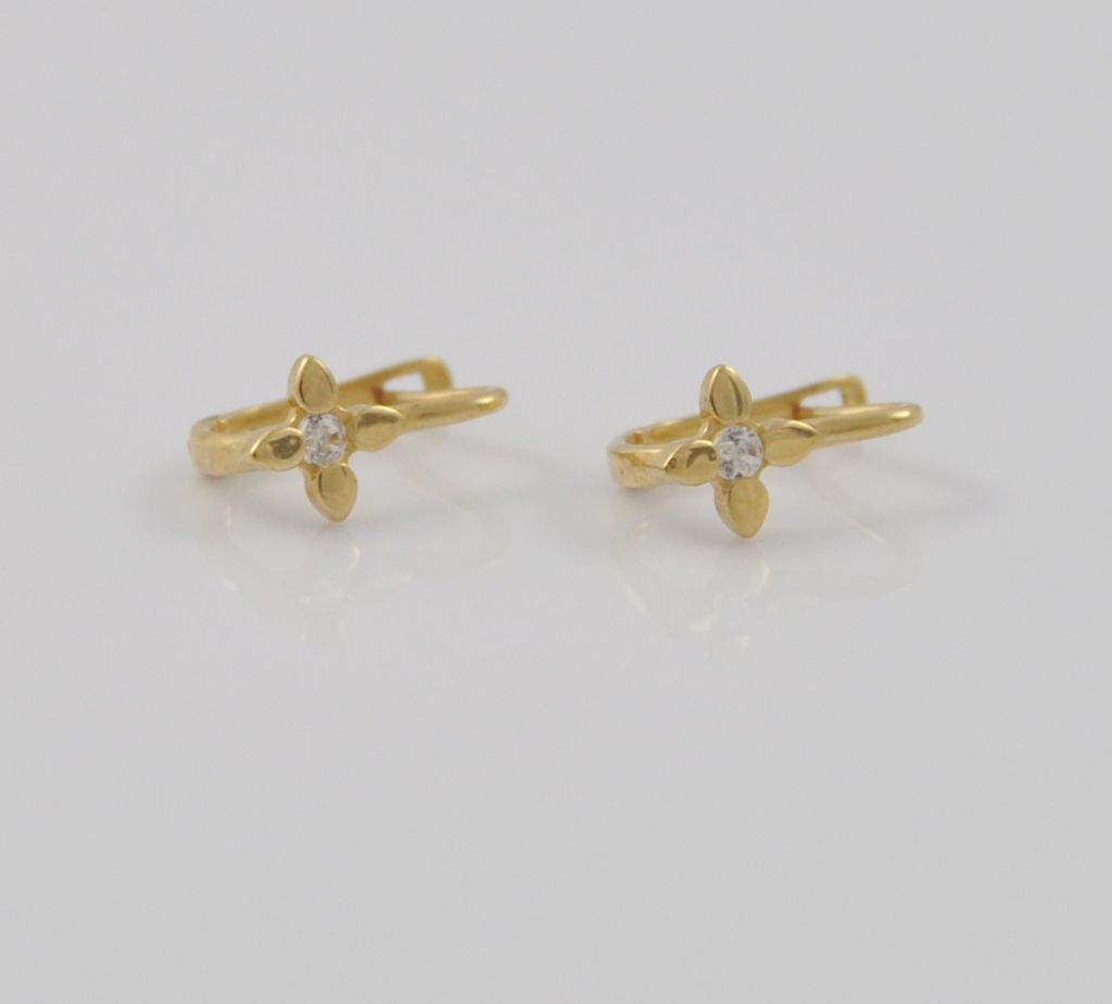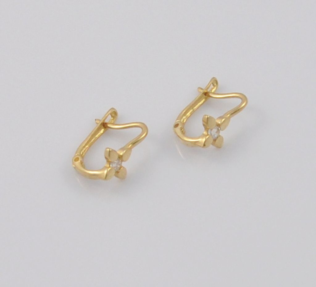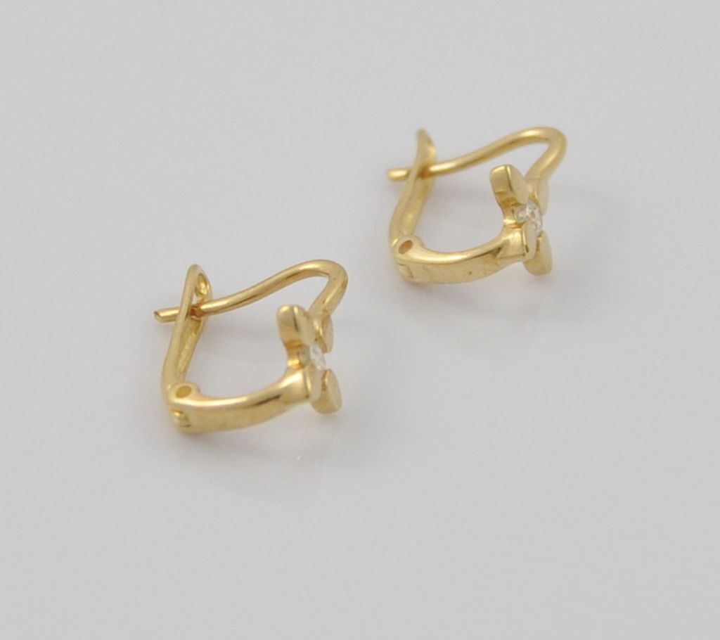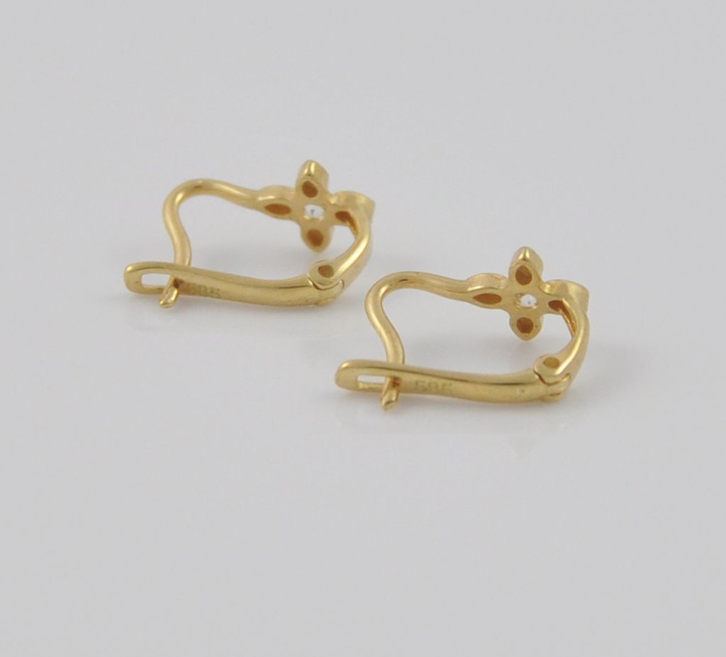 Złote polerowane kolczyki wykonane z wysokiej jakości żółtego złota próby 585 (14 karat). Kolczyki zapinane na zapięcie angielskie o wysokości 11 mm i szerokości kwiatka 6 mm. Waga kolczyków wynosi 0,9 gr (+/- 0,10 gr).