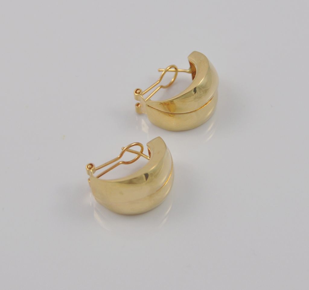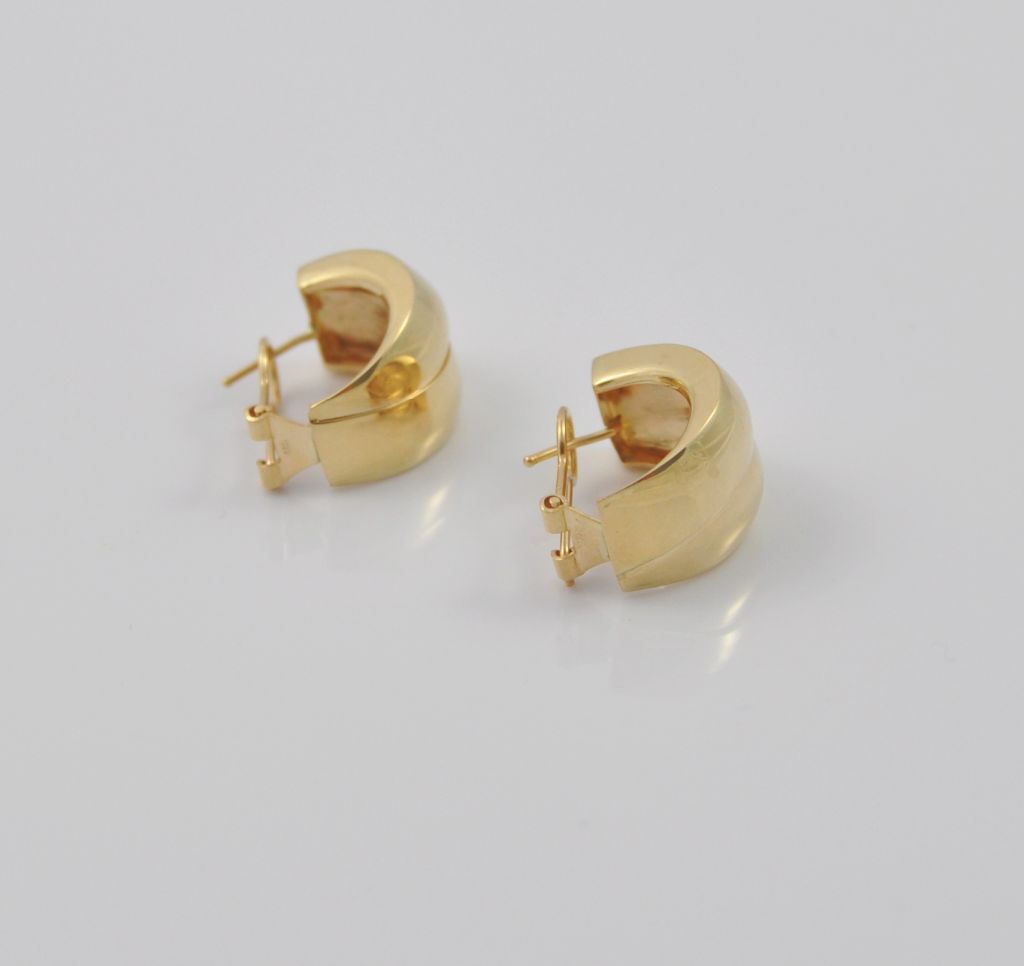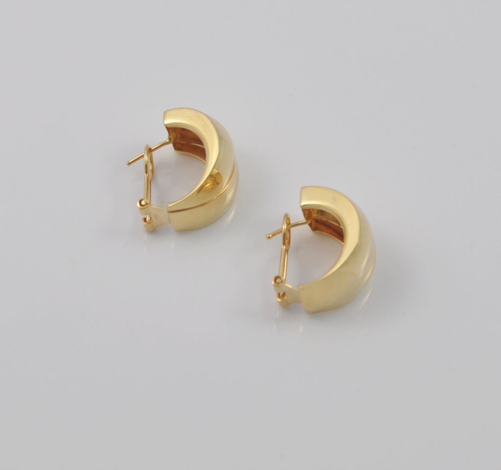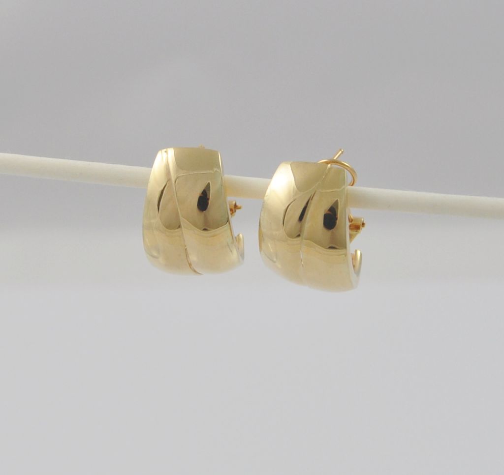 Złote kolczyki wykonane z wysokiej jakości żółtego złota próby 585 (14 karat). Modowe polerowane blaszki o wysokości 20 mm i szerokości 13 mm. Waga kolczyków wynosi 6,11 gr (+/- 0,10 gr).