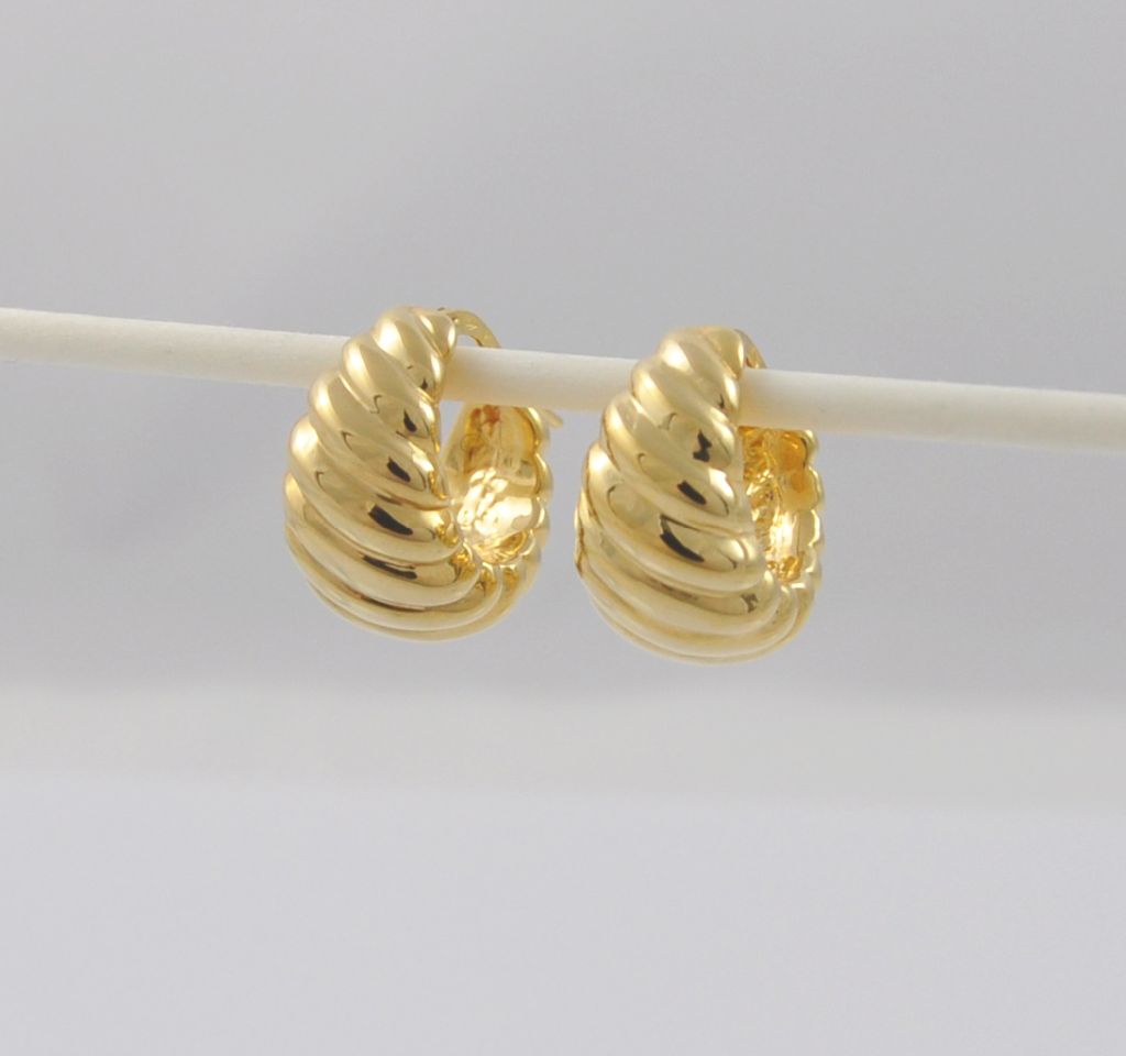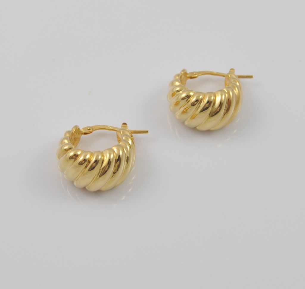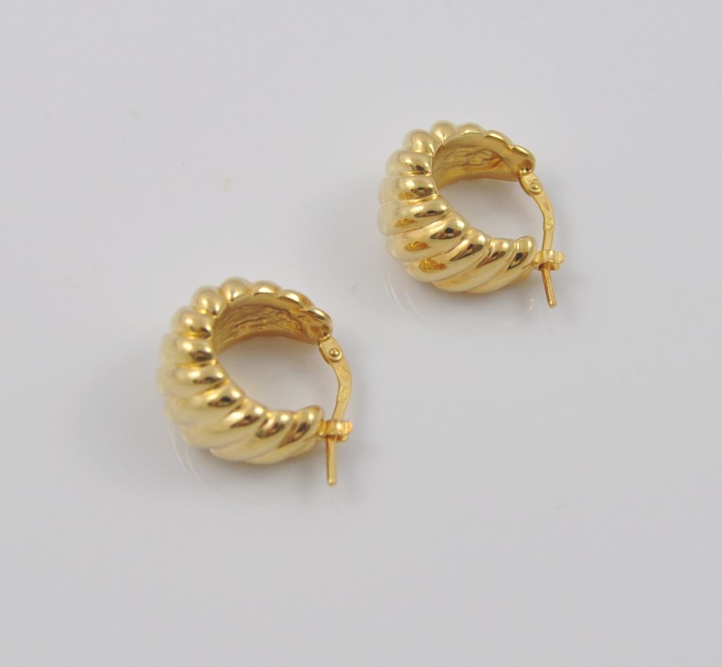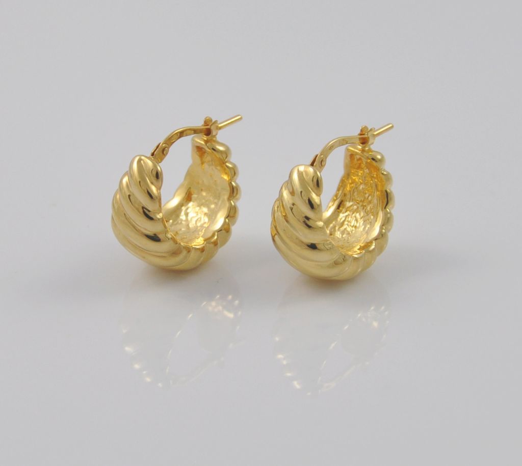 Złote kolczyki wykonane z wysokiej jakości żółtego złota próby 585 (14 karat). Modowe kolczyki o średnicy 18 mm i szerokości 11 mm. Waga kolczyków wynosi 3,60 gr (+/- 0,10 gr).