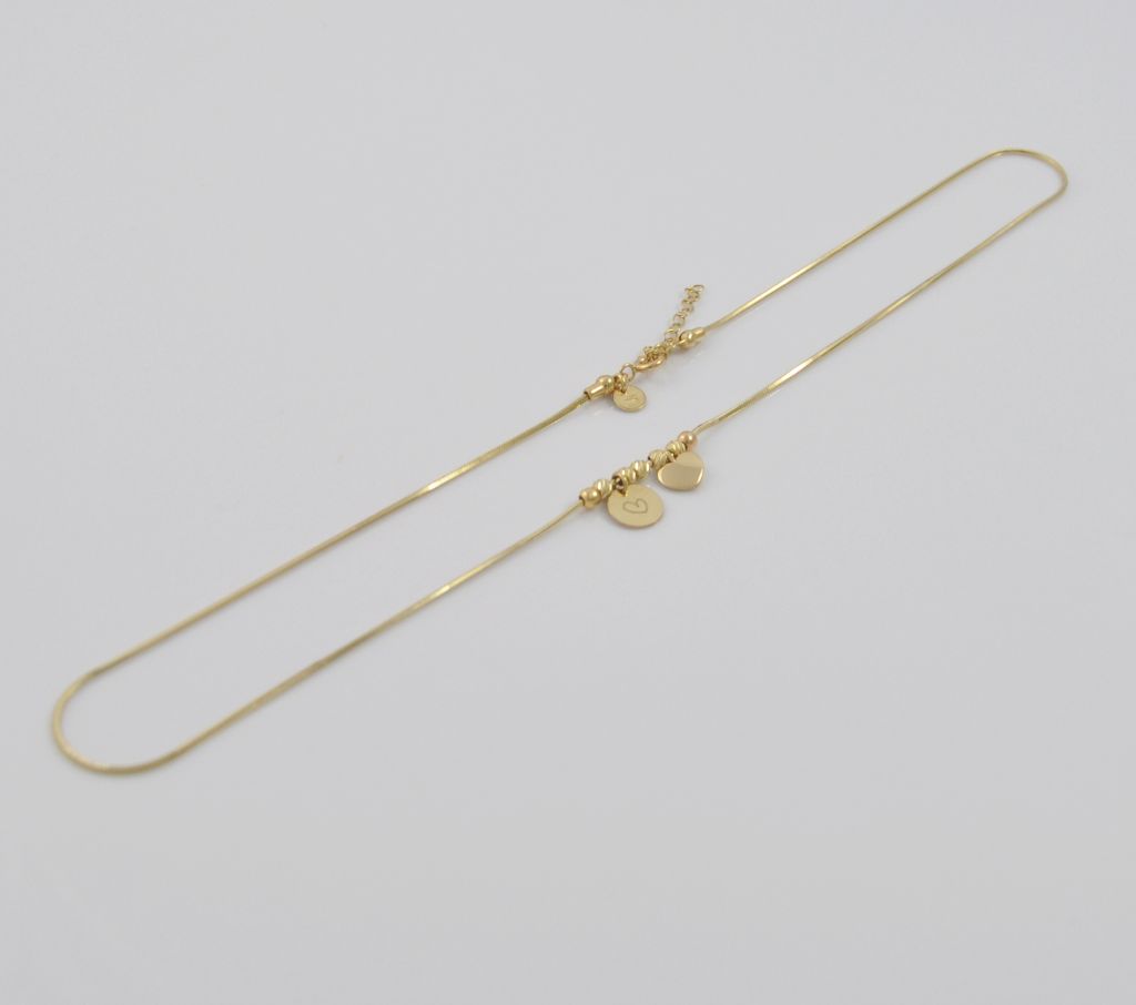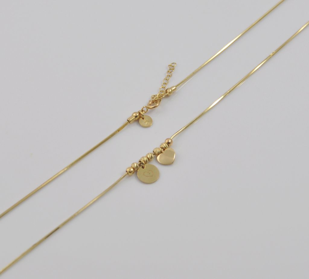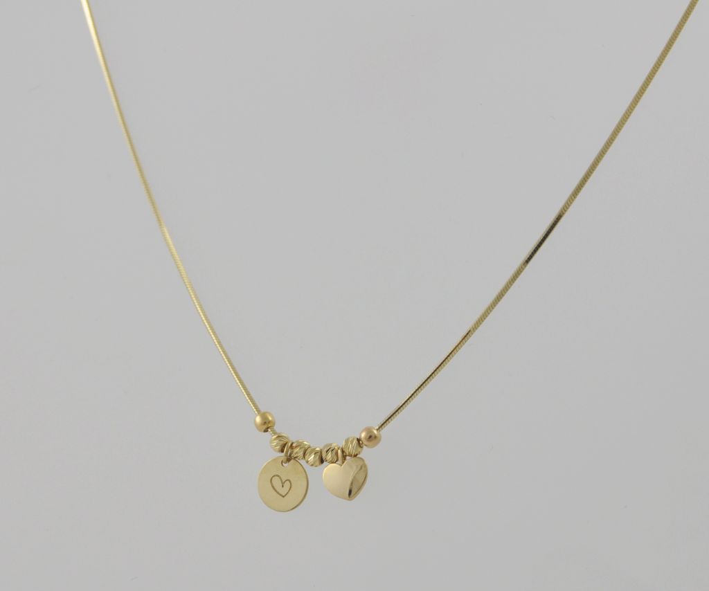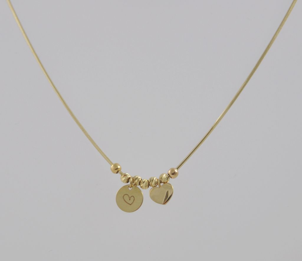 Złoty naszyjnik wykonany z wysokiej jakości żółtego złota próby 585 (14 karat). Modowy naszyjnik o długości 44,5 (41,5 cm + 3 cm regulacja) ozdobiony złotymi polerowanymi oraz diamentowanymi elementami. Waga naszyjnika wynosi 5,58 g (+/- 0,10 gr).