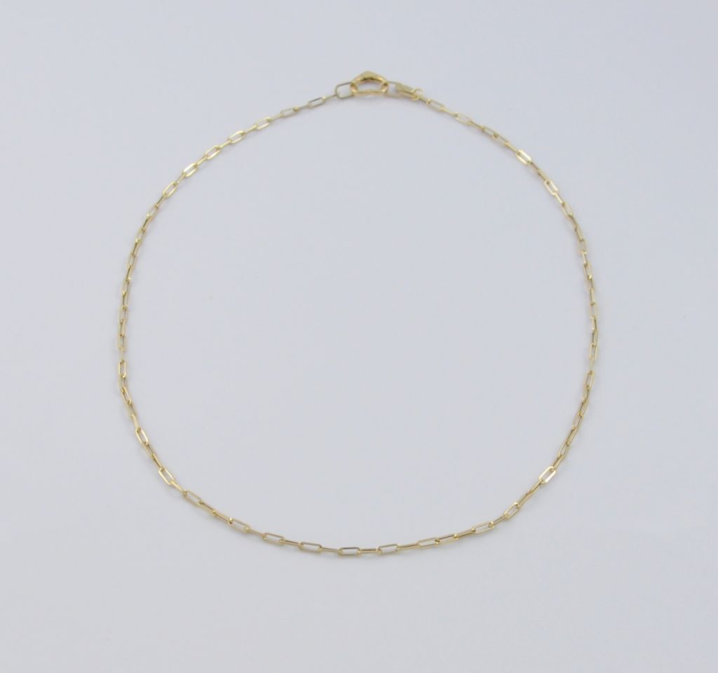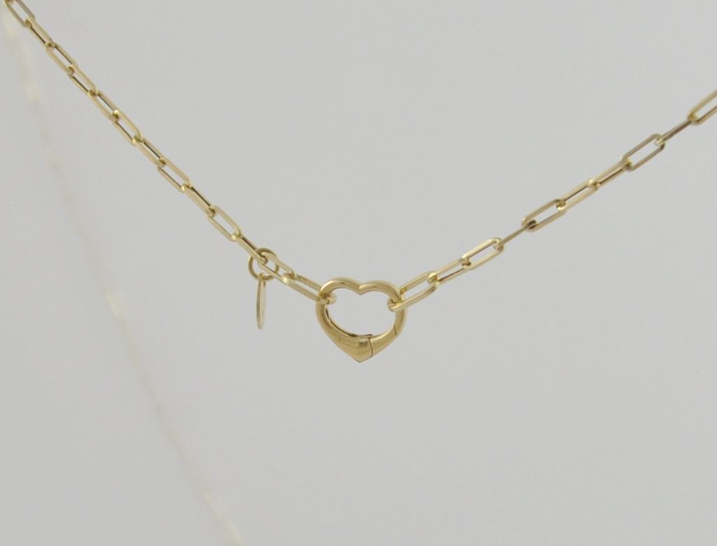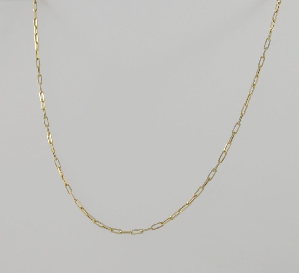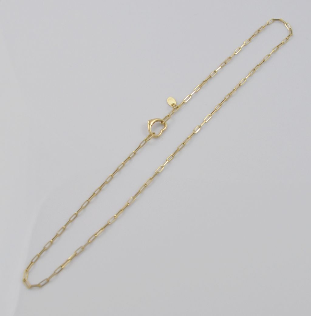 Złoty łańcuszek wykonany z wysokiej jakości żółtego złota próby 585 (14 karat). Modowy łańcuszek długie ogniwa zapinany na polerowane serce. Długości łańcuszka wynosi 45,5 cm oraz wymiarach ogniw 2/5 mm. Waga łańcuszka wynosi 3,39 gr (+/- 0,10 gr).