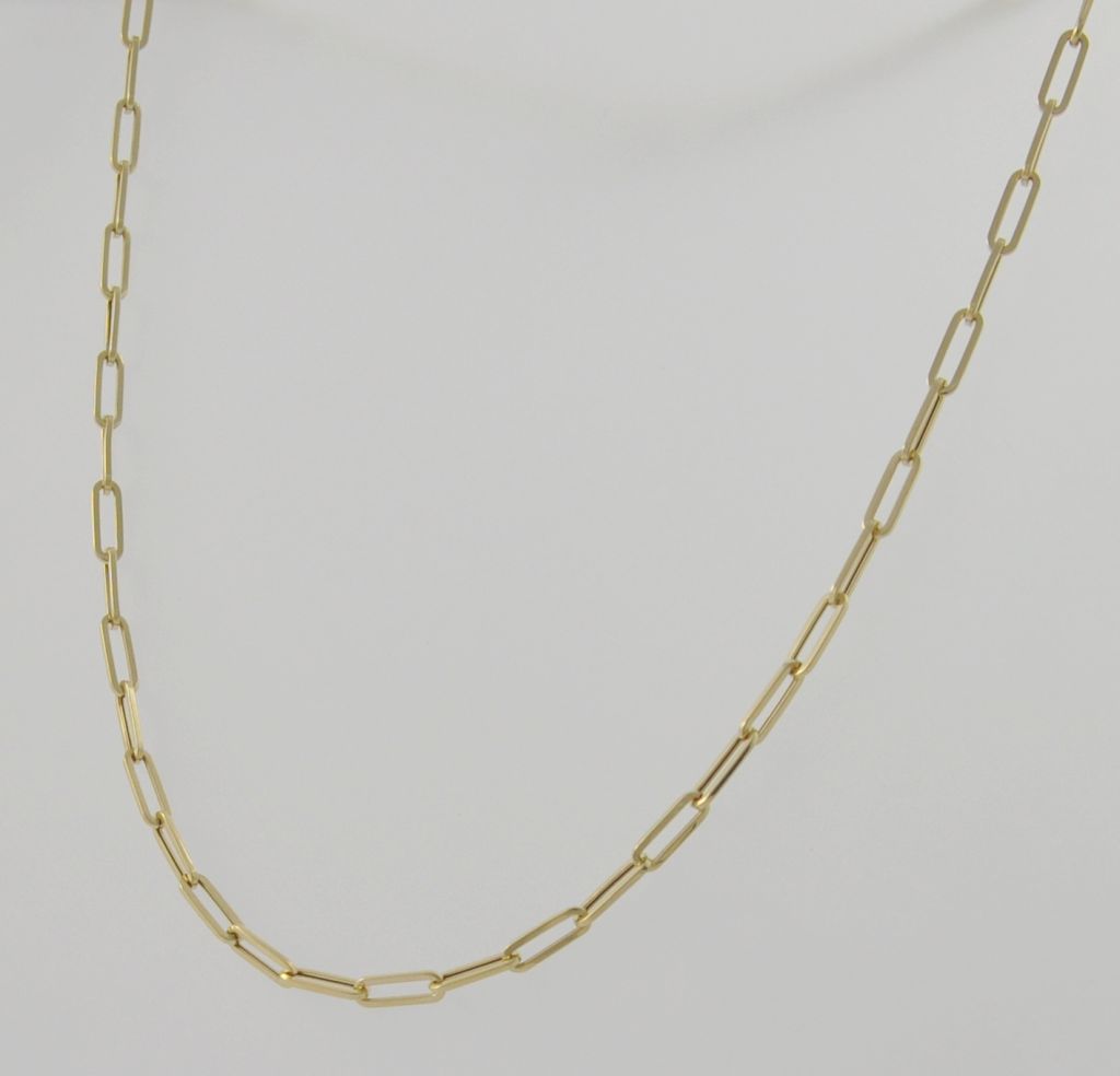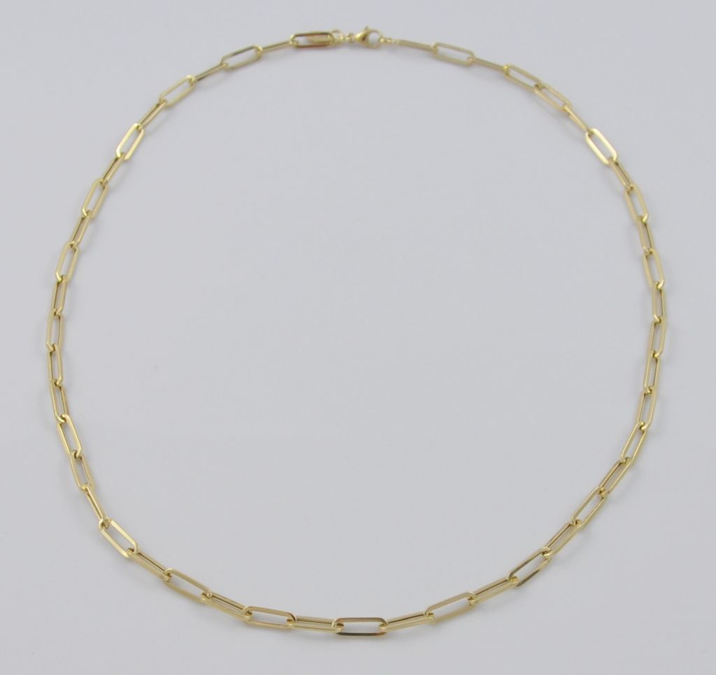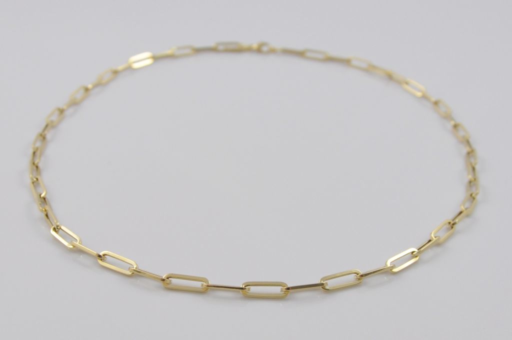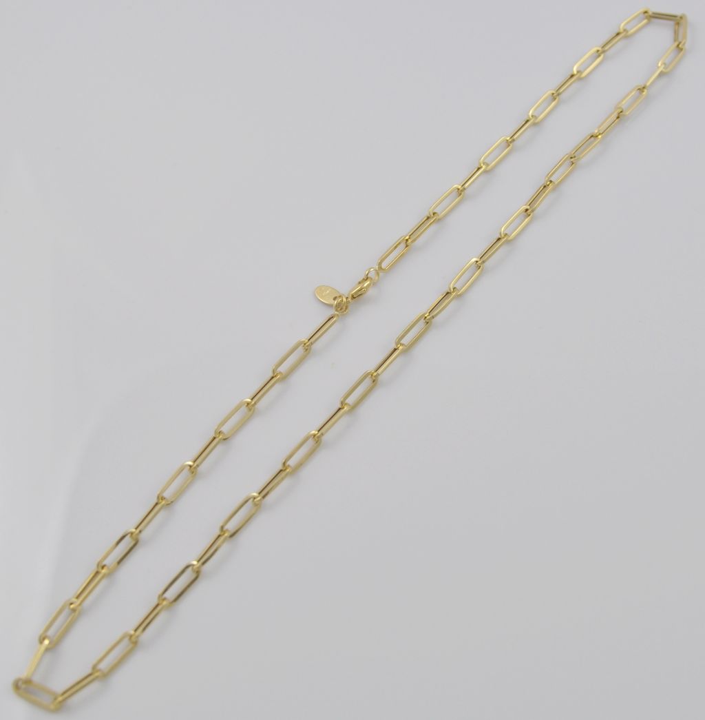 Złoty łańcuszek wykonany z wysokiej jakości żółtego złota próby 585 (14 karat). Modowy łańcuszek długie ogniwa o długości 46 cm oraz wymiarach ogniw 4/11 mm. Waga łańcuszka wynosi 5,35 gr (+/- 0,10 gr).