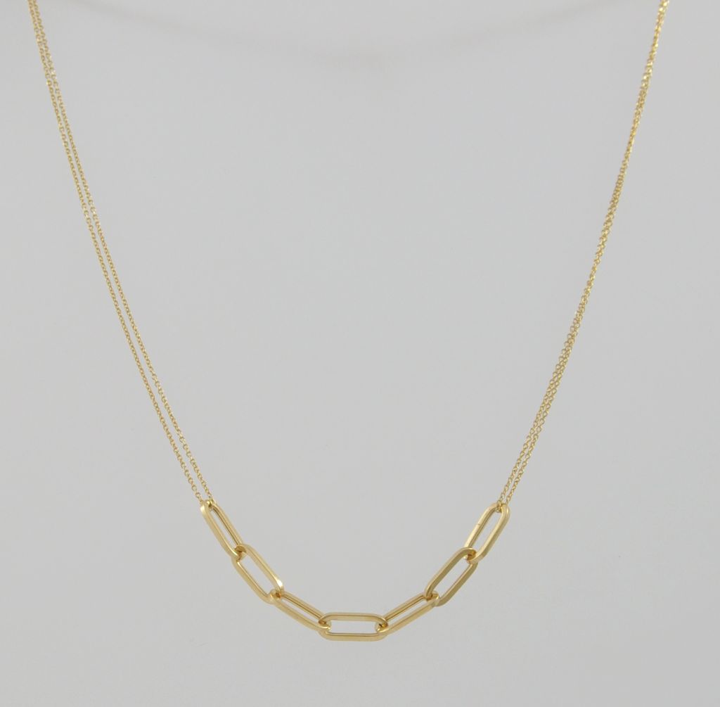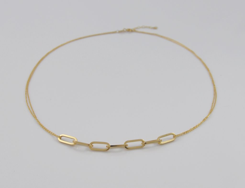 Złoty naszyjnik wykonany z wysokiej jakości żółtego złota próby 585 (14 karat). Modowy podwójny naszyjnik ozdobiony długimi ogniwami o długości 45 cm (42 cm + 3,5 cm regulacja). Waga naszyjnika wynosi 2,72 g (+/- 0,10 gr).