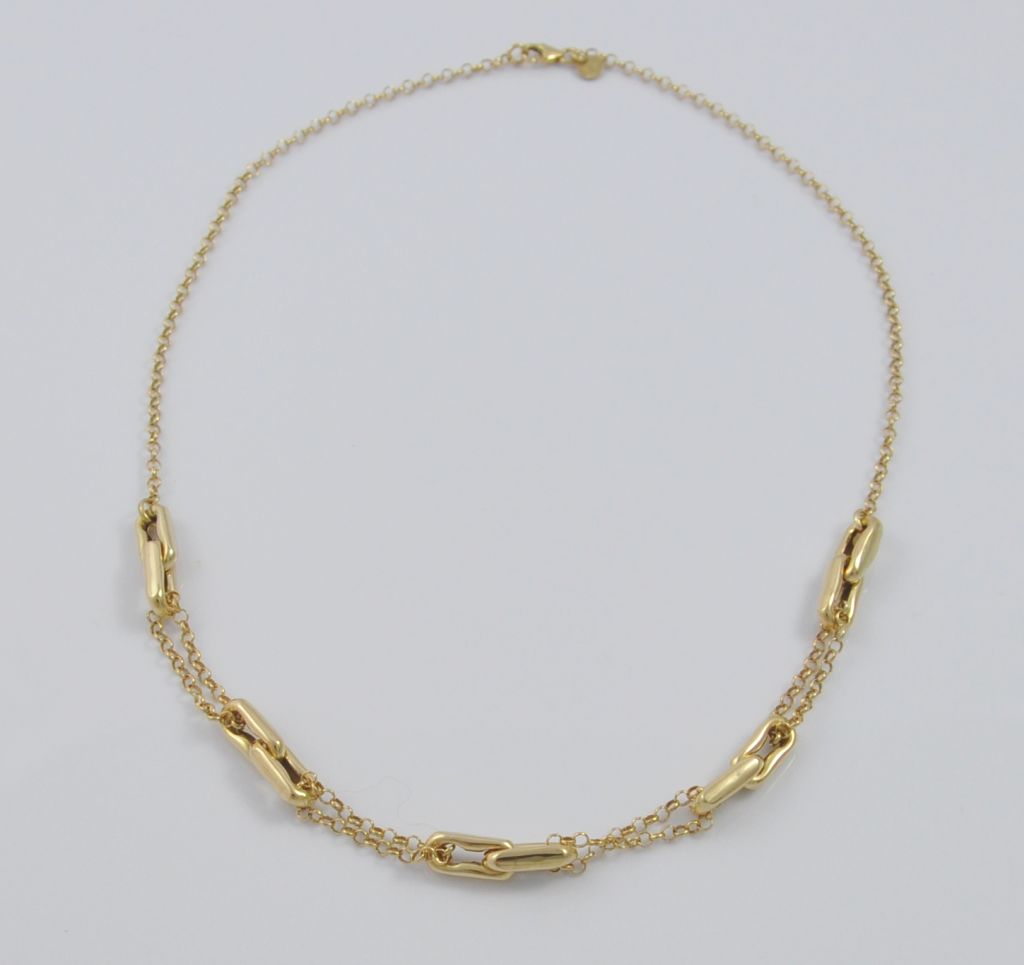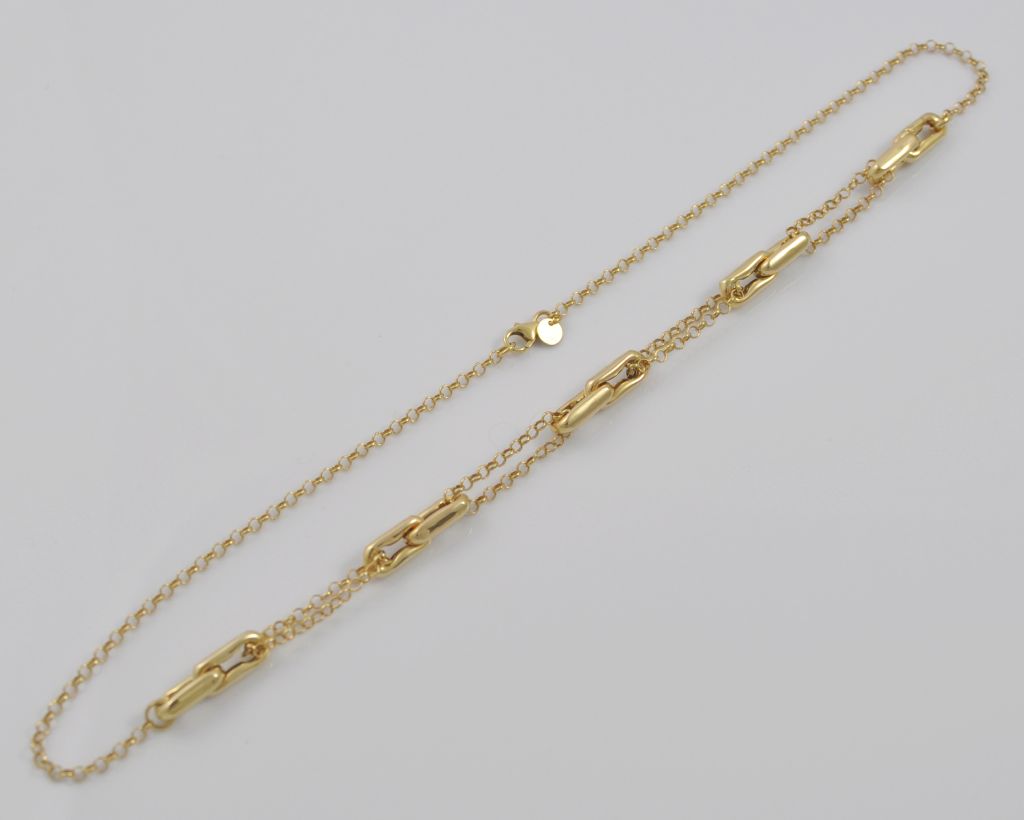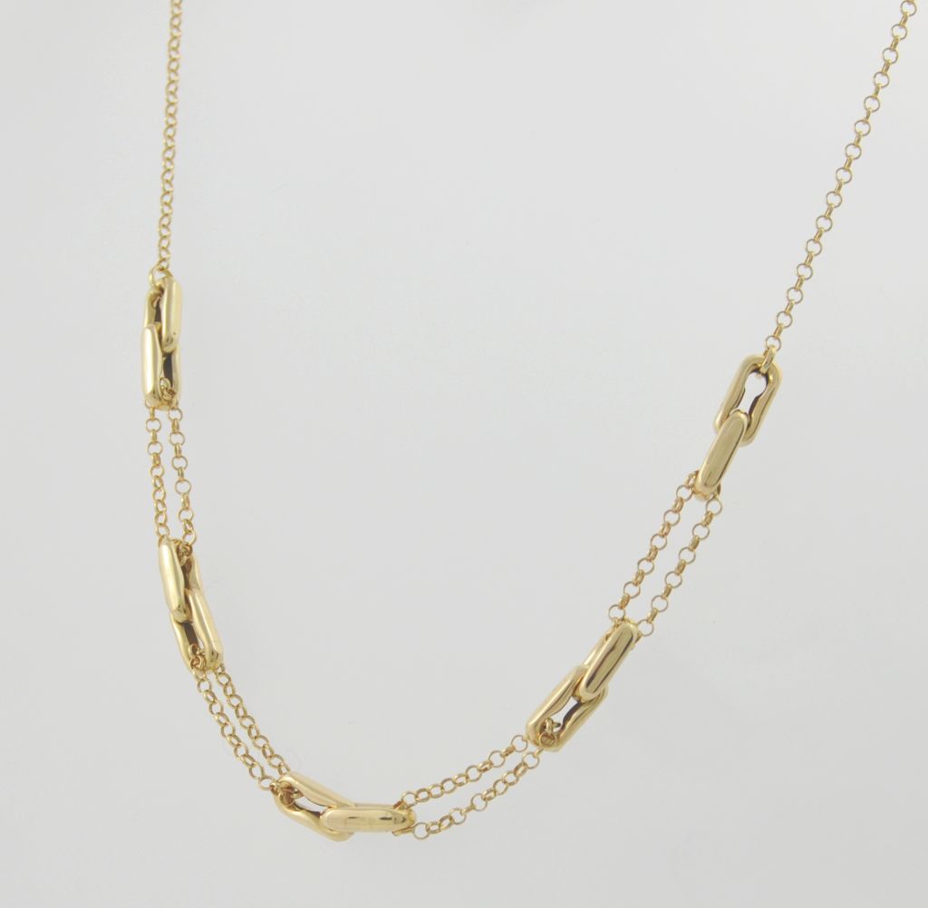 Złoty naszyjnik wykonany z wysokiej jakości żółtego złota próby 585 (14 karat). Modowy naszyjnik o długości 46,5 cm. Waga naszyjnika wynosi 8,40 g (+/- 0,10 gr).