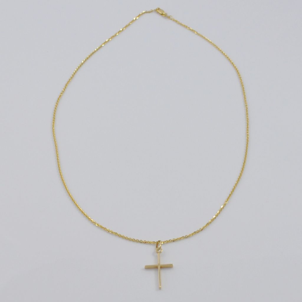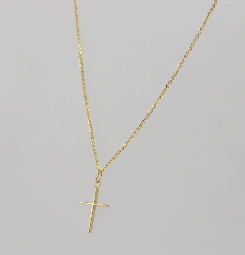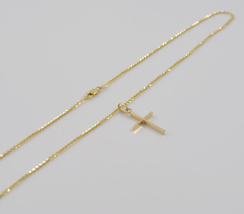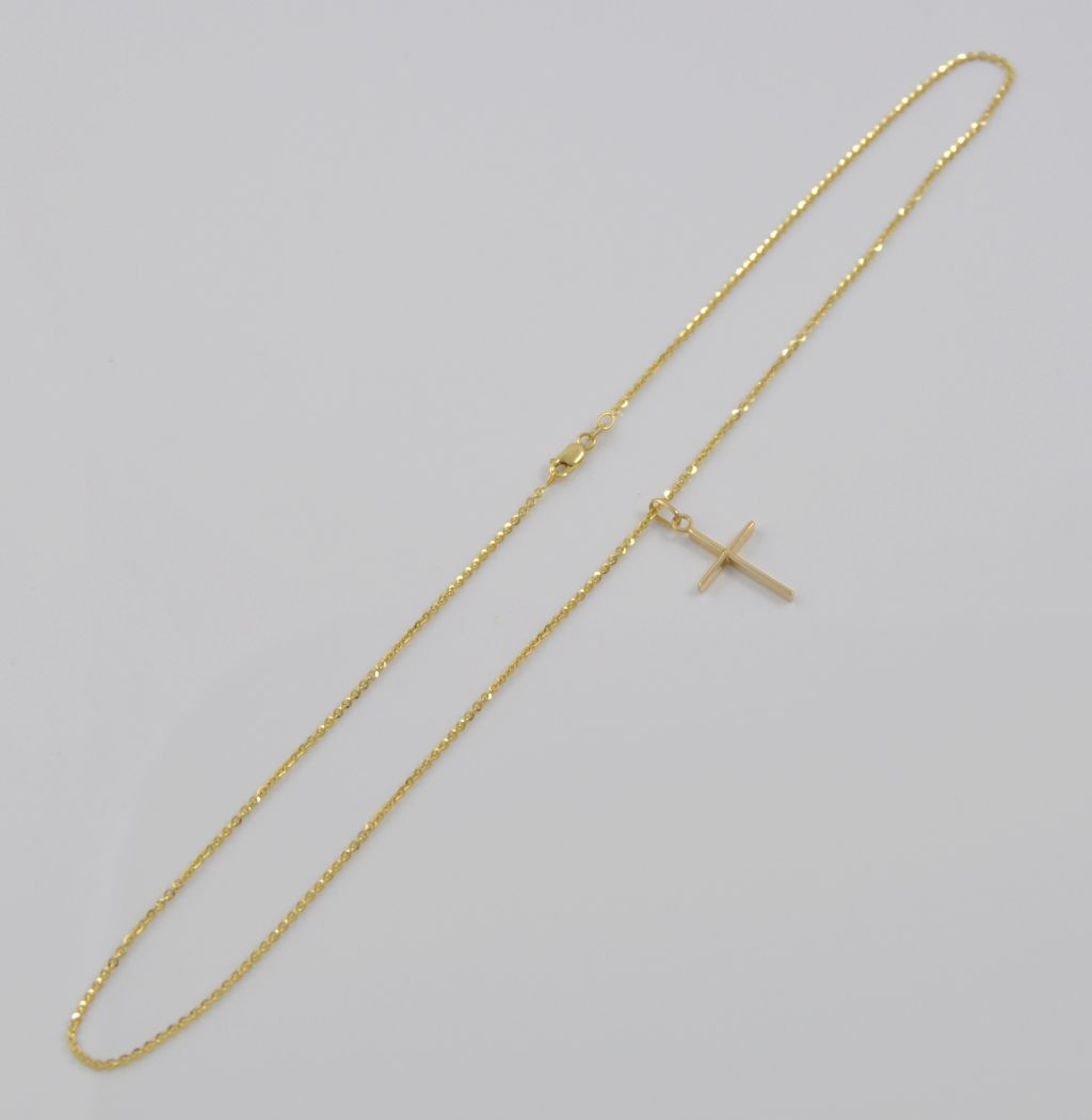 Złoty naszyjnik wykonany z wysokiej jakości żółtego złota próby 585 (14 karat). Łańcuszek o splocie ankier o długości 50 cm, i szerokości 1 mm. Waga łańcuszka wynosi 3,55 gr (+/- 0,10 gr) ozdobiony złotym polerownym krzyżem wykonanym z wysokiej jakości żółtego złota próby 585 (14 karat). Krzyż ma wymiary 15 mm szerokości, 20 mm długości oraz 2 mm grubości. Waga zawieszki wynosi 1,29 gr (+/- 0,10 gr). Waga łańcuszka wraz z zawieszką wynosi 4,84 gr (+/- 0,10 gr).